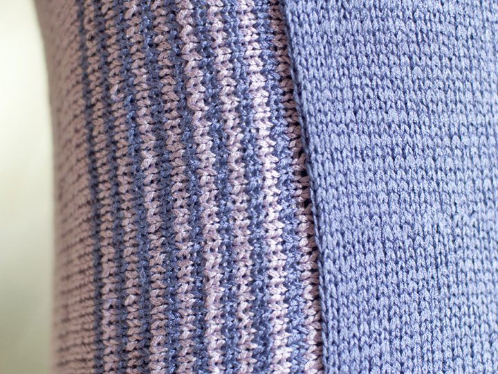Did you ever try to knit stripes lengthwise? It’s not easy and it often doesn’t look very pretty. Not that way with “Sheila”! Here your work the small front part first, then you pick up stitches from both edges on the left and right and continue working side and back parts sideways. The result: Although you work the stripes in rows they seem to be lengthwise.