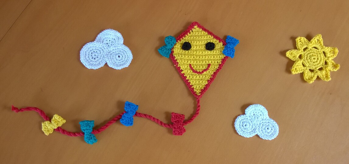 Häkelt man die Teile doppelt und füllt sie mit Watte aus, kann man sie auch frei hängen oder an einem Mobile benutzen.