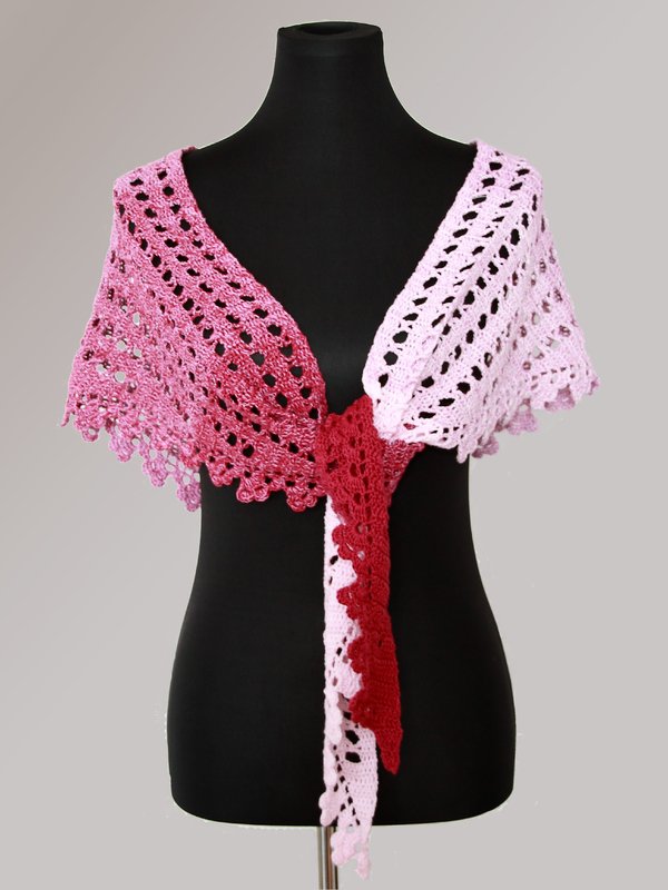 ''Little Pink Clouds'' is a pretty shawl crocheted sideways. The border which reminds little clouds is crocheted as you go. The shape is achieved through increases and decreases in regular intervals.