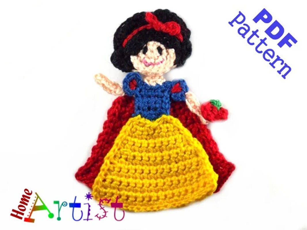 The Snow White measures about 4 in. in height by 4 in. wide but the size can be varied by using thinner or thicker yarn and types of hook. Colors can be changed according to your personal preference. The pattern is designed for worsted weight yarn and uses American English crochet terms.