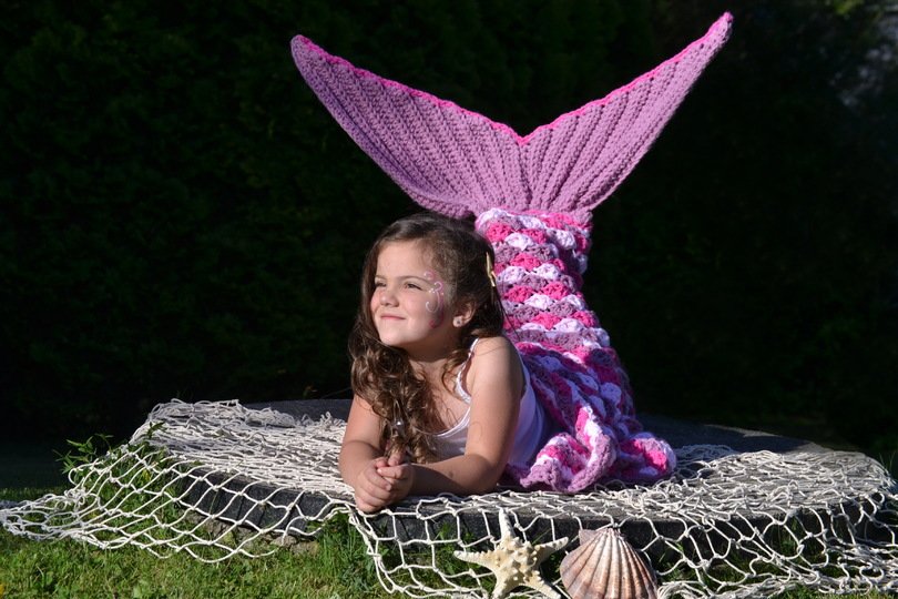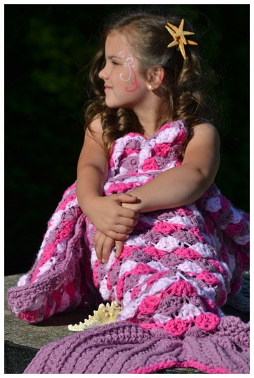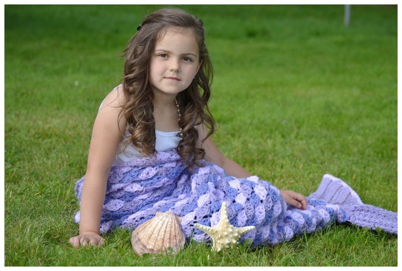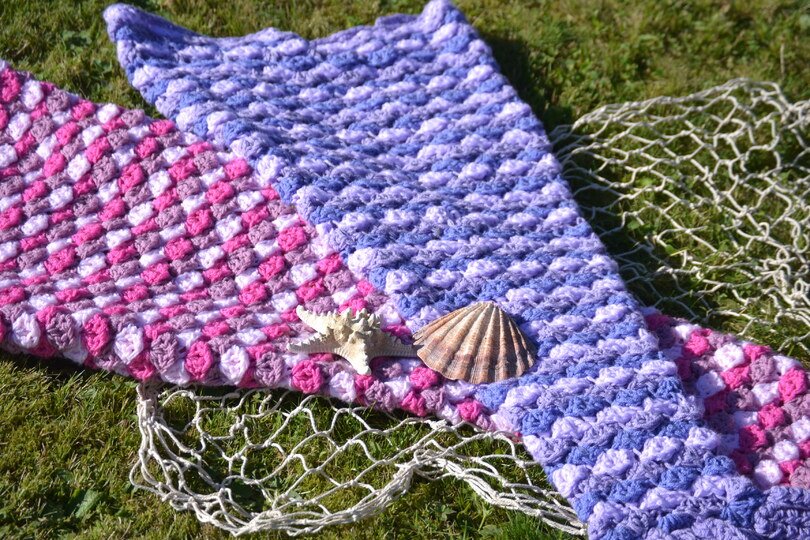 Umfassende Anleitung zum häkeln einer Meerjungfrauen-Decke in jeder Größe (Tabelle mit 14 Größen) und in 4 abgewandelten Varianten.