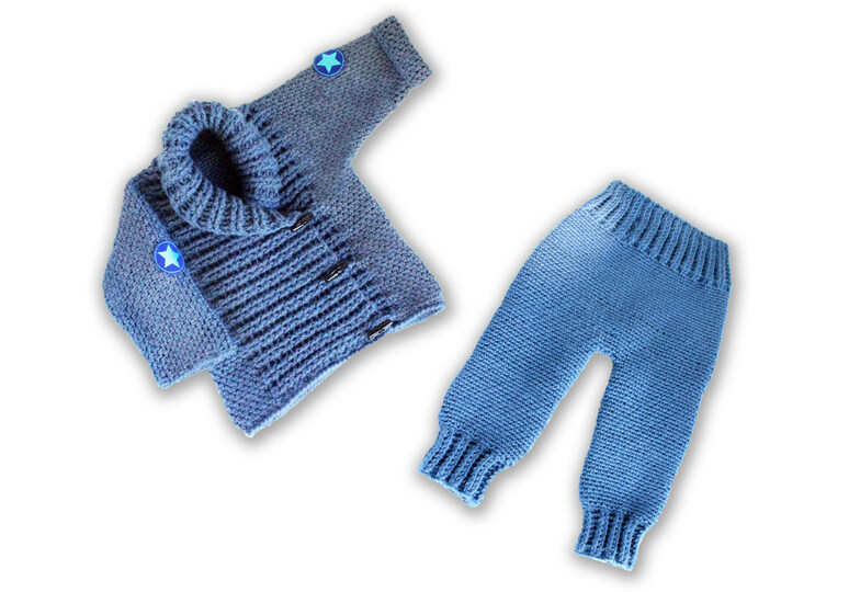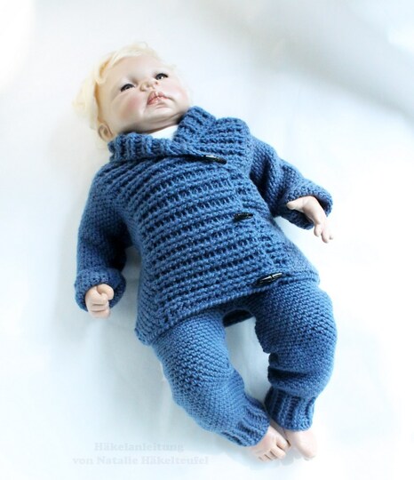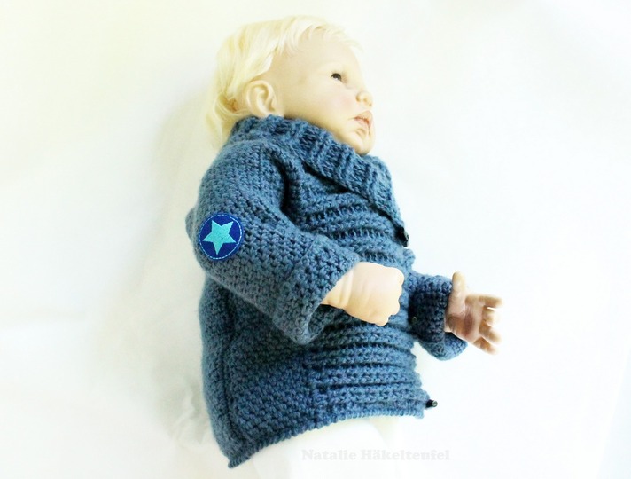 Jacket: Katia Basic Merino, 52% Merino, 48% Acrylic, 50gr./120m., colour Denim, for size 0-3 m: 200 g and 50 g more for each additional size, alternative: Lana Grossa COOL WOOL Big, 100 % virgin wool, running length: approx. 120 m / 50 g, crochet hook no. 3 and 3.5, buttons, 3-5 pcs. (depending on the size of the jacket).