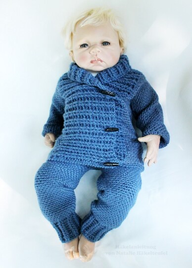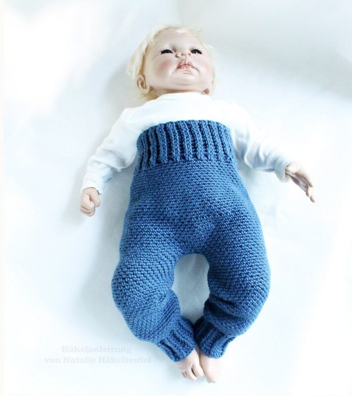 Trousers: Katia Basic Merino, 52% Merino, 48% Acrylic, 50gr./120m., colour Denim, for size 0-3 m: 150 g and 50 g more for each additional size, alternative: Lana Grossa COOL WOOL Big, 100 % virgin wool, running length: approx. 120 m / 50 g, crochet hook no. 3; 3.5; 4.