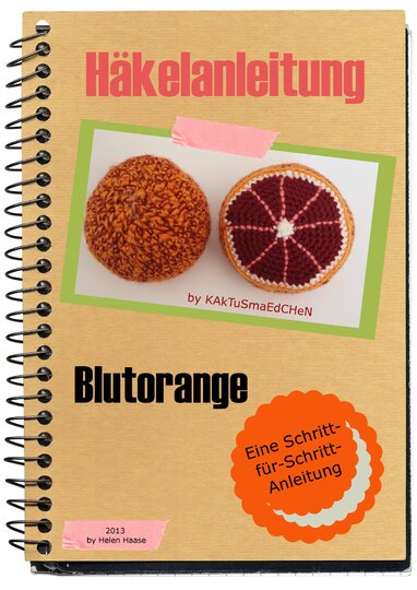 Eine Häkelanleitung für eine halbe Blutorange. Die Anleitung umfasst 3 Seiten und 6 Fotos.