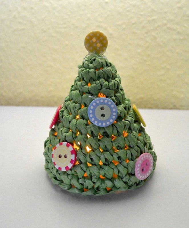 Du benötigst nur Reste aus Bastband in grün (idealerweise 3 cm breit) und eine Häkelnadel der Stärke 3-4, ein paar bunte Knöpfe, eine Heißklebepistole und ein elektrisches Teelicht.