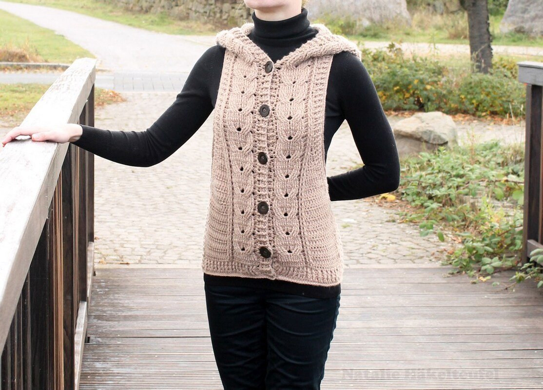 Waistcoat with hood and cable braid, size 36-46 (EU)