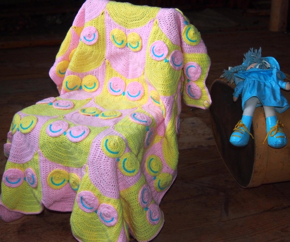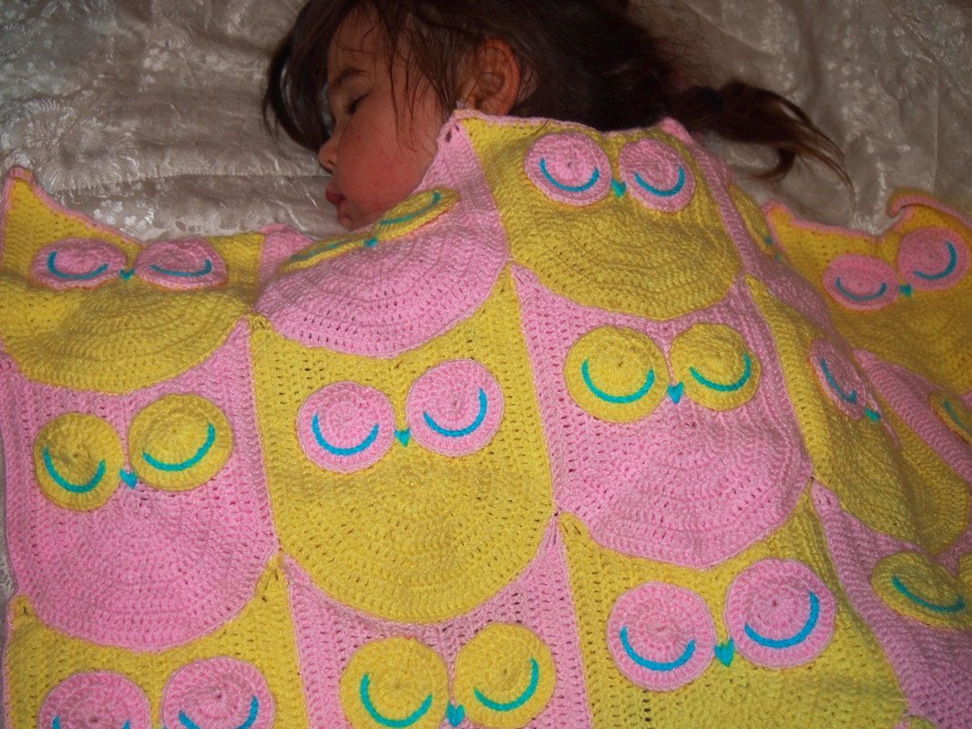 The blanket that you can create with this pattern will be about 34 inches (86 cm) high and 29 inches (74 cm) wide. Surely you can add or remove owls to make the blanket of your own size. Each owl is about 7 inches (18 cm) high and 5.5 inches (14 cm) wide. But the size of your owls will depend on the yarn and crochet hook you’ll choose.