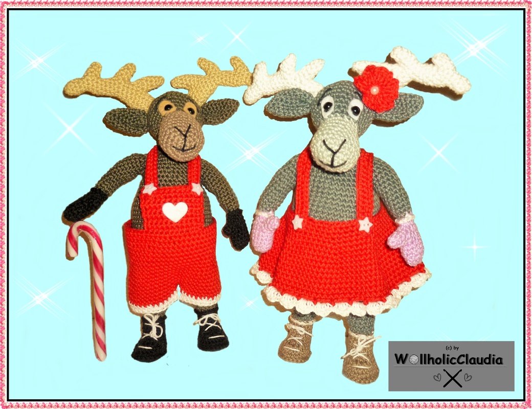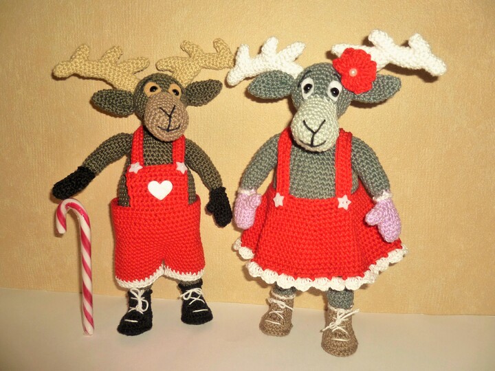 Das Elchpaar Elmar und Erika haben sich extra für die Weihnachtszeit festlich gekleidet. Die Anleitung beinhaltet den Elch, die Latzhose, das Röckchen und die Blume.