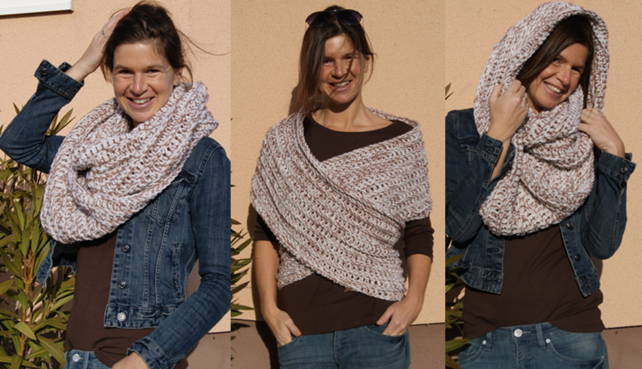 Der Loop 3 in 1 ist multifunktional und wärmt Schulter, Rücken, Hals oder auch Kopf – je nachdem, wie er getragen wird. Ideal zum Aufpeppen von einfärbigen Langarmshirts wird er in deinen Lieblingsfarben schnell zum Lieblingsteil. Mit ein paar mehr oder weniger Maschen und Reihen kann Länge und Breite ganz einfach variiert werden.
