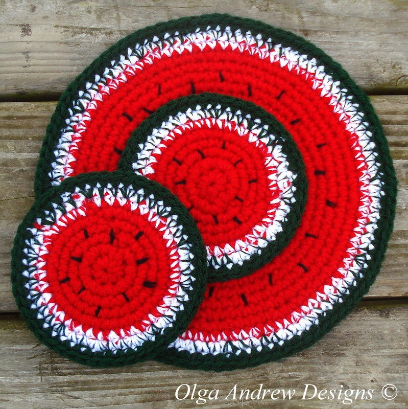 Watermelon doily and coasters. Easy crochet tutorial pattern instant download -- Olga Andrew Designs Pattern 076.