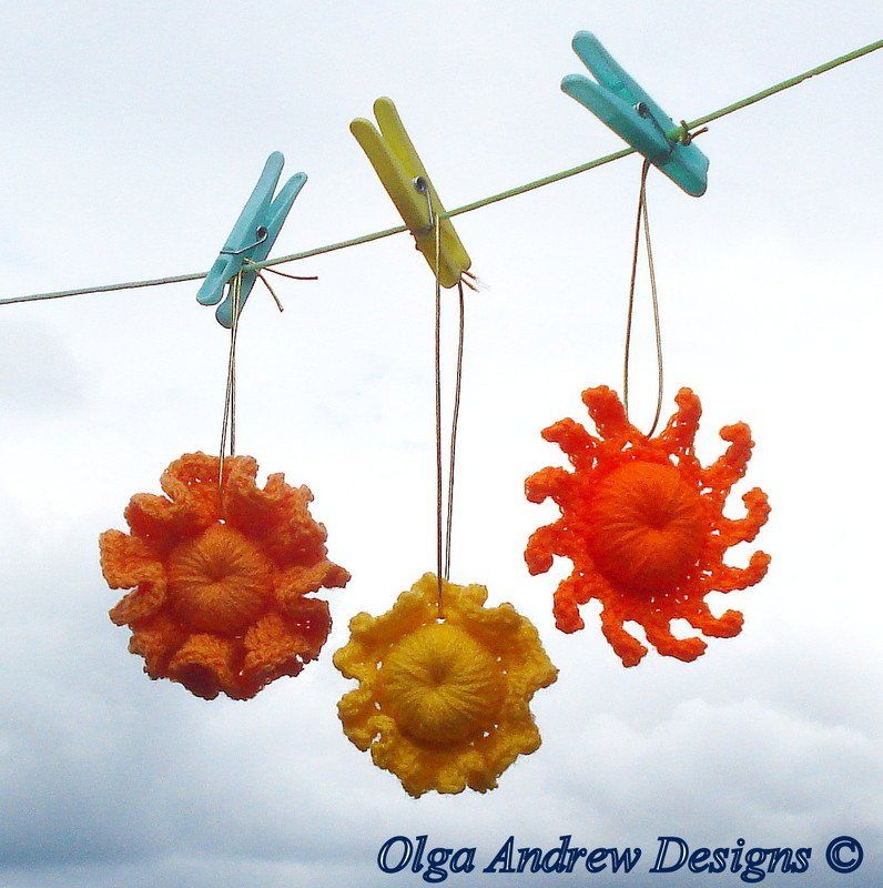 This is a step-by-step tutorial pattern for a hand crocheted suns, which can be used as a baby’s pram (cot, push chair etc.) garland (mobile), as a toy or decoration (e.g. for Christmas tree). There are three designs available.