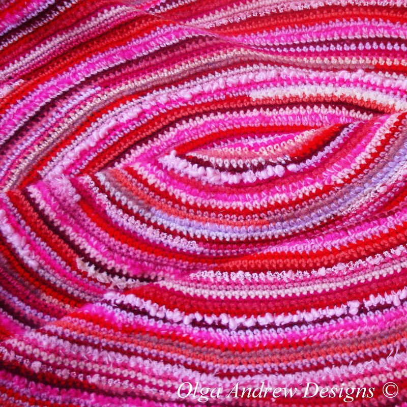 1) crochet yarn (I used Premium Acrylic DK yarn as basic yarn and many other types of yarn – mohair, boucle, brushed wool, fluffy yarn etc.) any shades of red, dark red, pink, cream, light lilac or mixtures. Total weight of shawl without fringe is 923 g, with fringe 1010 g (1.01 kg). 2) crochet hook (I used hook size 5 mm).