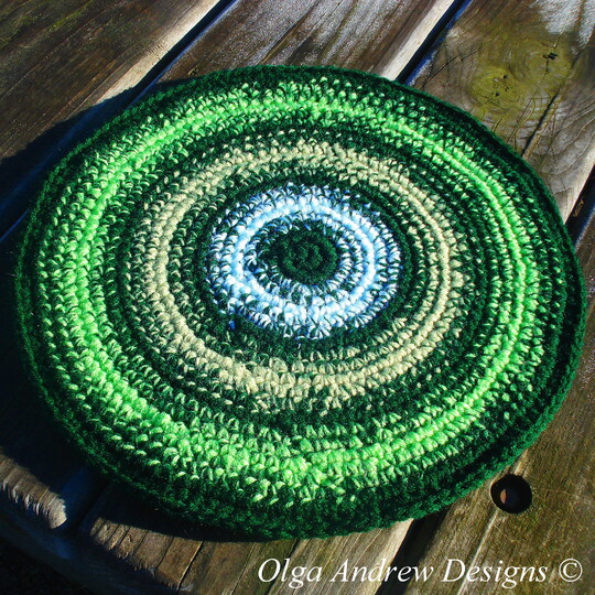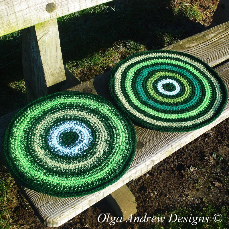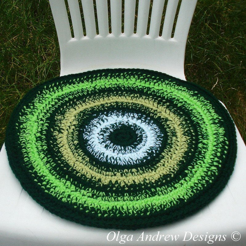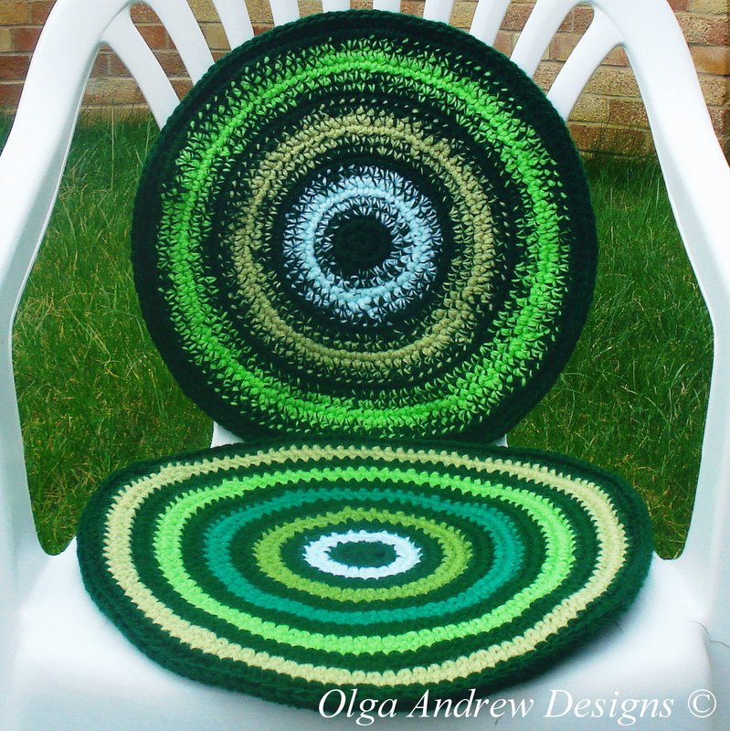 This is a step-by-step tutorial pattern for a hand crocheted double striped chair seat cushion, which can be used as chair (stool, bench, armchair etc.) seat cover or decoration. There are two designs available for the chair seat cushion: contrasting stripes with a district colour change and contrasting stripes with a gradual colour change. The back of the cushion is one-colour (dark green).