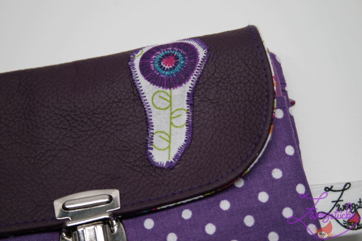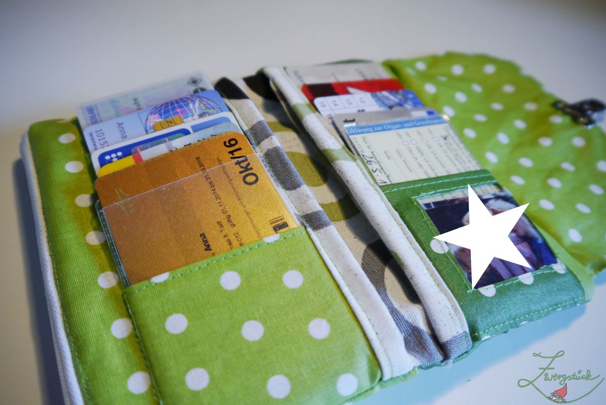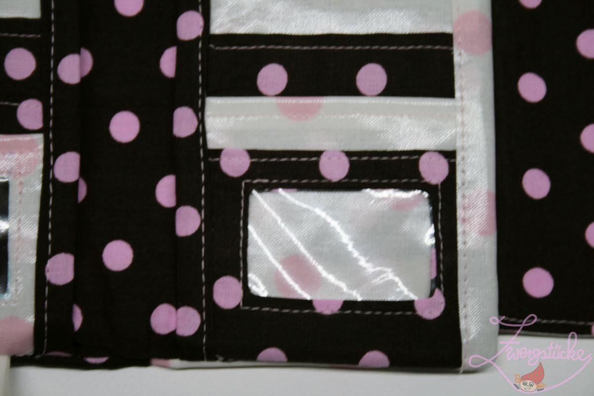 Die Basisanleitung besteht aus 8-10 Kartenfächern, zwei Einschubfächern innen, einem offenen Außenfach und zwei Reißverschlussfächern. Verschlossen wird es mit einem Steckschloss. Aktuelle Erweiterungen gibt es für ein Kartenfach mit Sichtfenster, z.B. für das Foto deiner Liebsten und das Anbringen von Kam Snaps. Weitere Erweiterungen sind in Arbeit. Außerdem gibt es eine Google+-Gruppe, in der dir deine Fragen zum Schnittmuster beantwortet werden.
