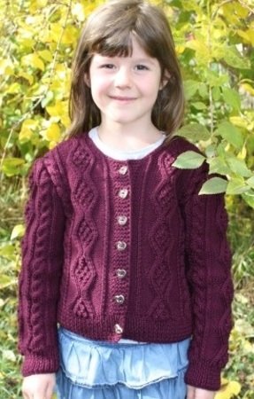 Sophia - This short cable cardigan is knitted with abundant cable patterns all over. It combines three different cable patterns, one combined with bubbles. It has a bold button selvage and is round-necked.