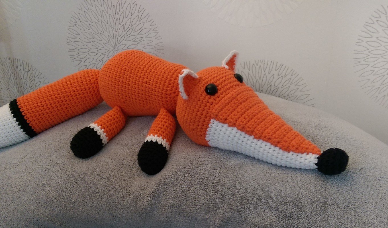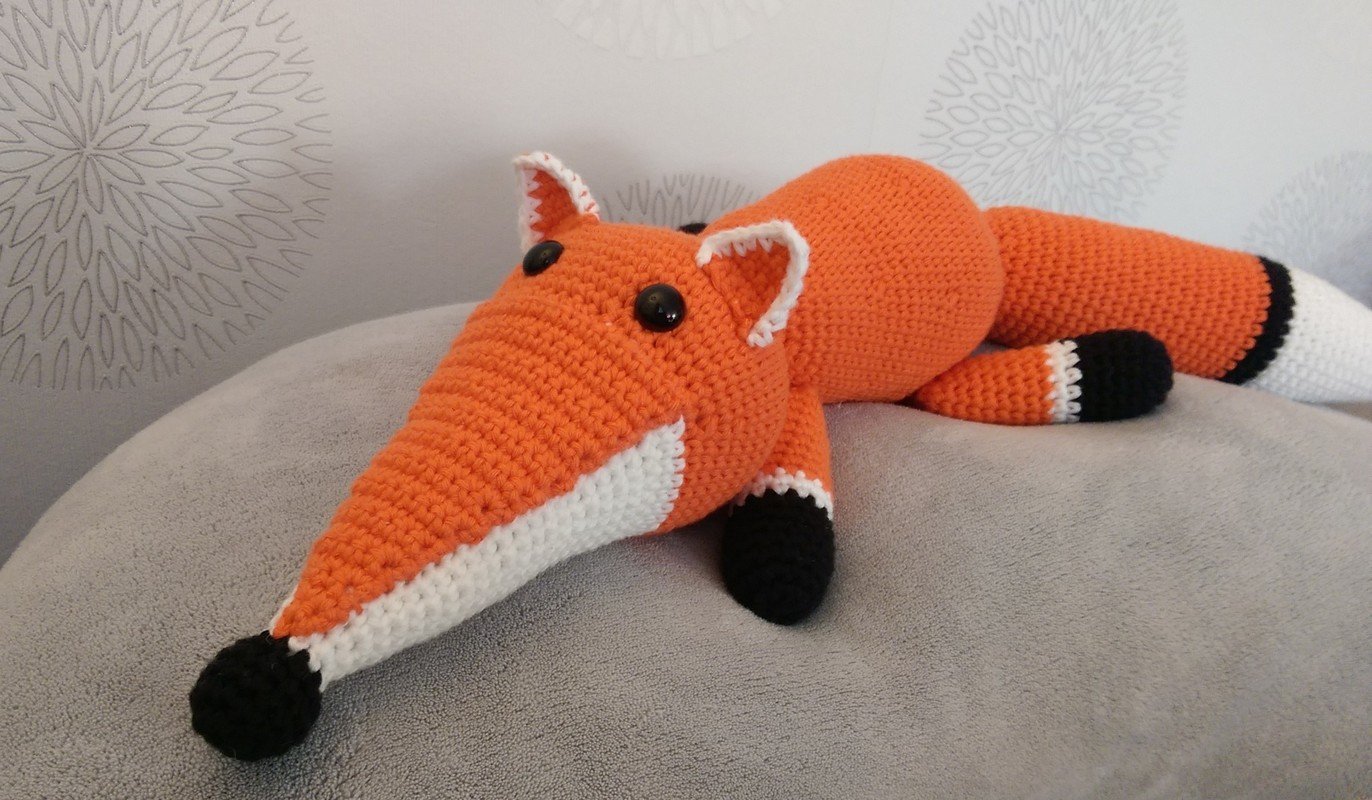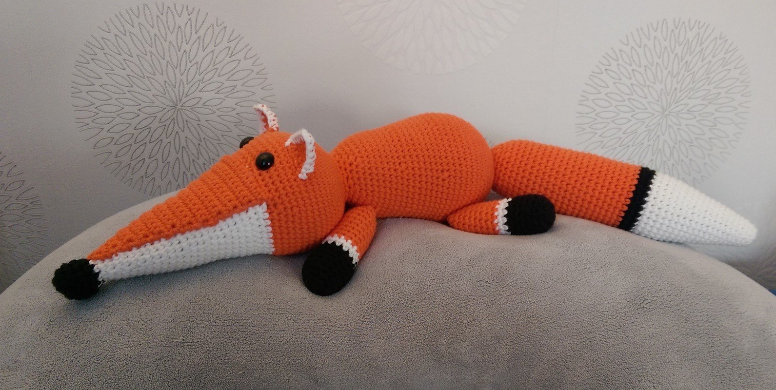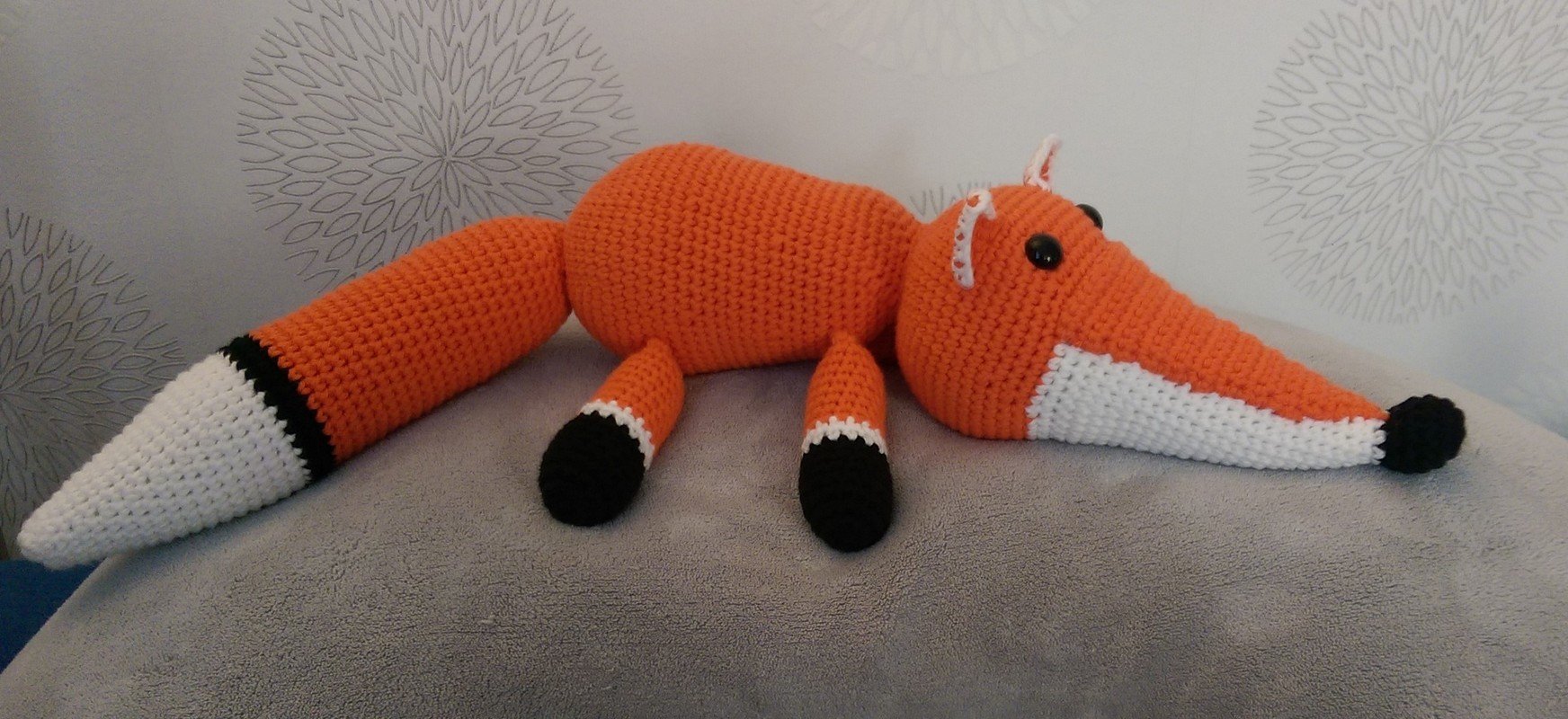 The finished Fox will be between 25 and 30 cm long (10 to 12 inch) dependinig on the used Yarn and Hook Size.