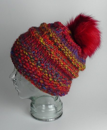 Material: 150 g Rot color (Farbe 82) „Collection Wolke Hegenbarth – Indian Summer“ (60% Wolle, 40% Polyacryl, LL = 50 m/50 g) von L&K. Stricknadeln und 1 kurze Rundstricknadel oder 1 Nadelspiel Nr. 8, 1 Häkelnadel Nr. 7. Nach Wunsch 1 Kunstbommel von Langendorf & Keller (L&K)