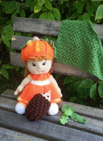 The PDF contains the instructions for the pumpkin hat, the shoes, the dress, the panties and the hedgehog & sheets.