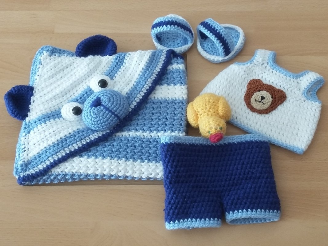 The PDF contains the instructions for the sweater, the pants, the shoes, the bath towel and the duckling.