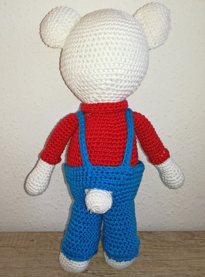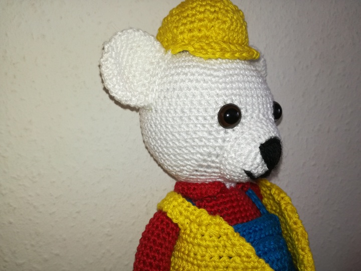 ♦ Yarn, for example: Schachenmayr Catania or Scheepjes Catona. Colors: • White (ca. 50 g) • Red (ca. 20 g) • Blue (ca. 30 g) • Dark Brown (ca. 5 g) • Yellow (ca. 25 g) • Black (Leavings) (These indications are for the bear at the cover. Of course you can crochet with the colors you like)