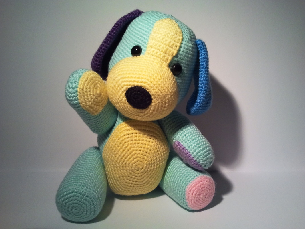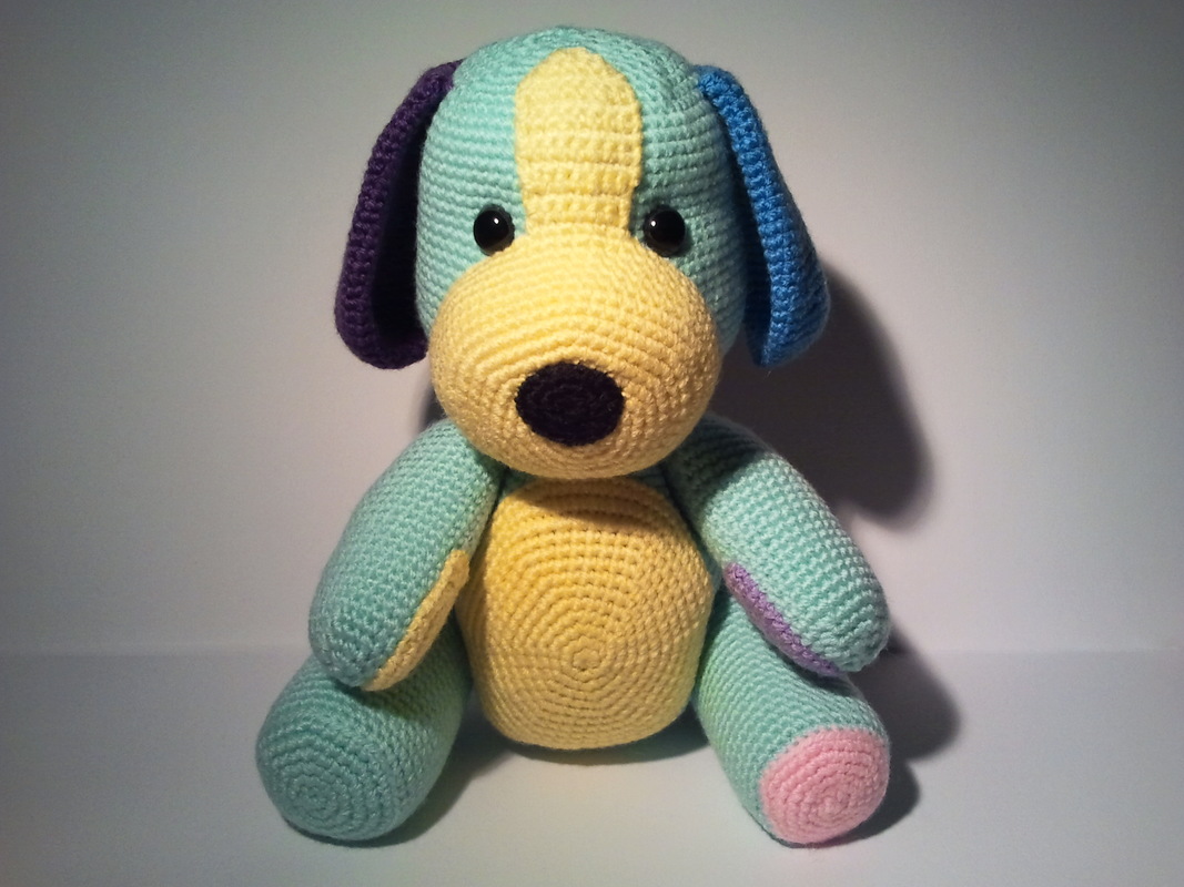 Als meine Nichte auf die Welt kam, habe ich Ihr einen Hund als Kuscheltier geschenkt! Diesen Hund hat Sie immer nur Teddy genannt! Inzwischen ist meine Nichte 23 Jahre alt und Sie hat diesen „Teddy“ immer noch! Allerdings ist er schon reichlich demoliert vom vielen kuscheln und waschen! Sie bat mich diesen Teddy nach zu häkeln! Und so ist dieser Hundeteddy entstanden!