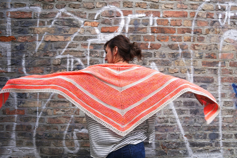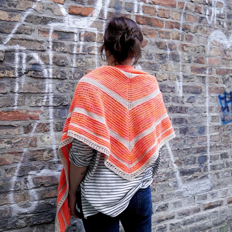 The Tunisian crochet triangle shawl "Peaches" is fashionably a real statement piece and goes quite easily from the hand. Quite untypical for Tunisian crochet, the triangular shawl impresses with a light, softly falling texture and comes up with a beautiful homogeneous structure that reminds of knitted. A real enrichment for your closet!