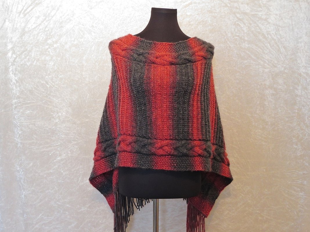 The Poncho is constructed as a large rectangle. To finish, two sides will be crocheted together. At least fringes are knotted at the new formed edge.