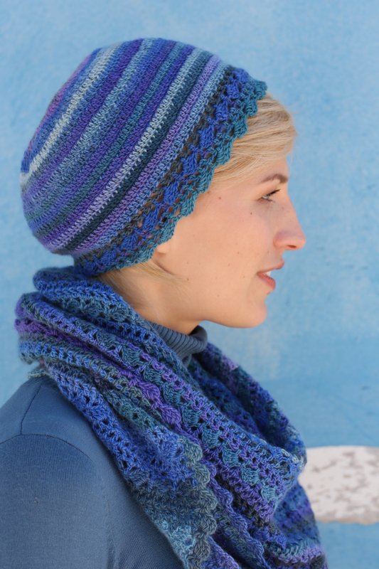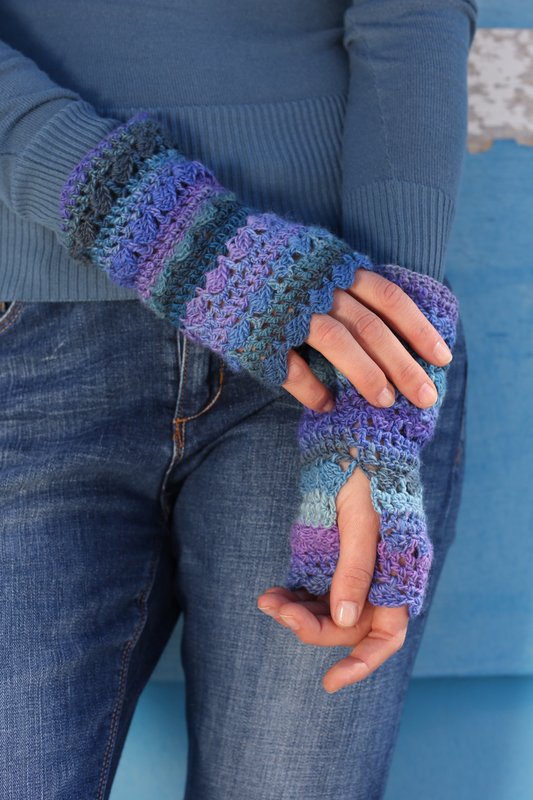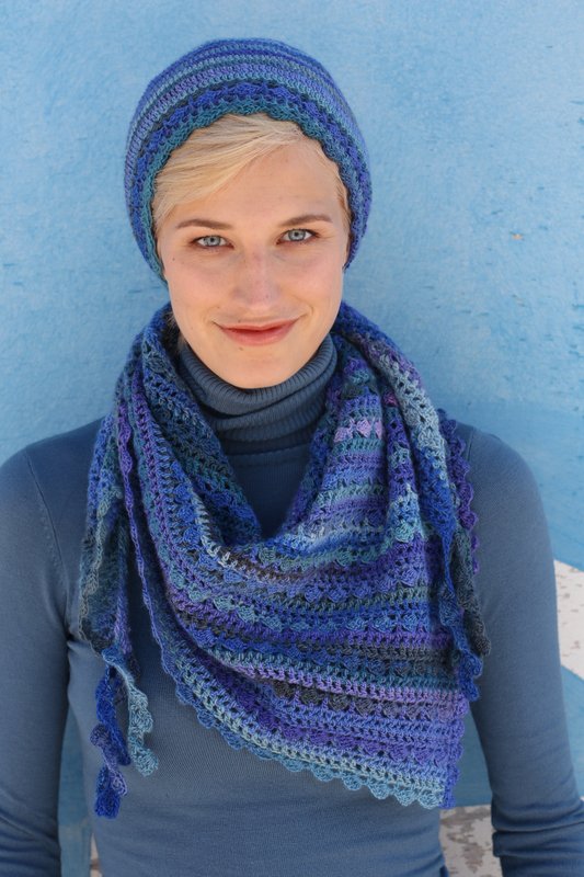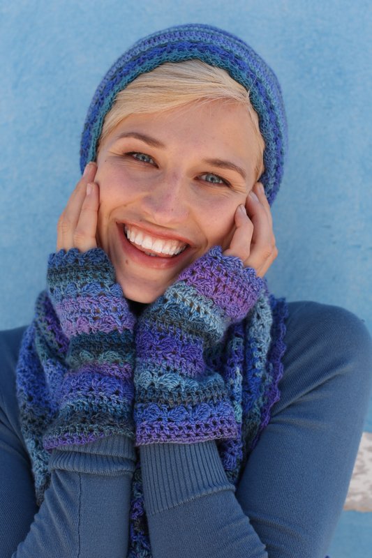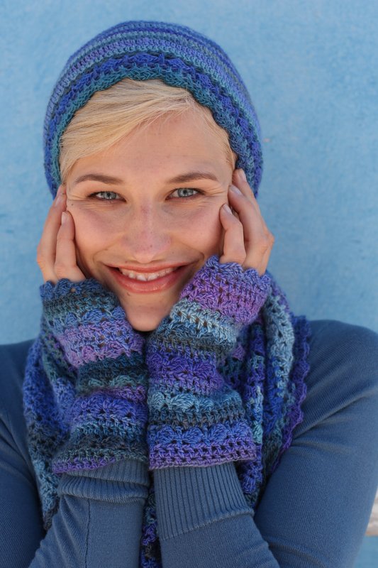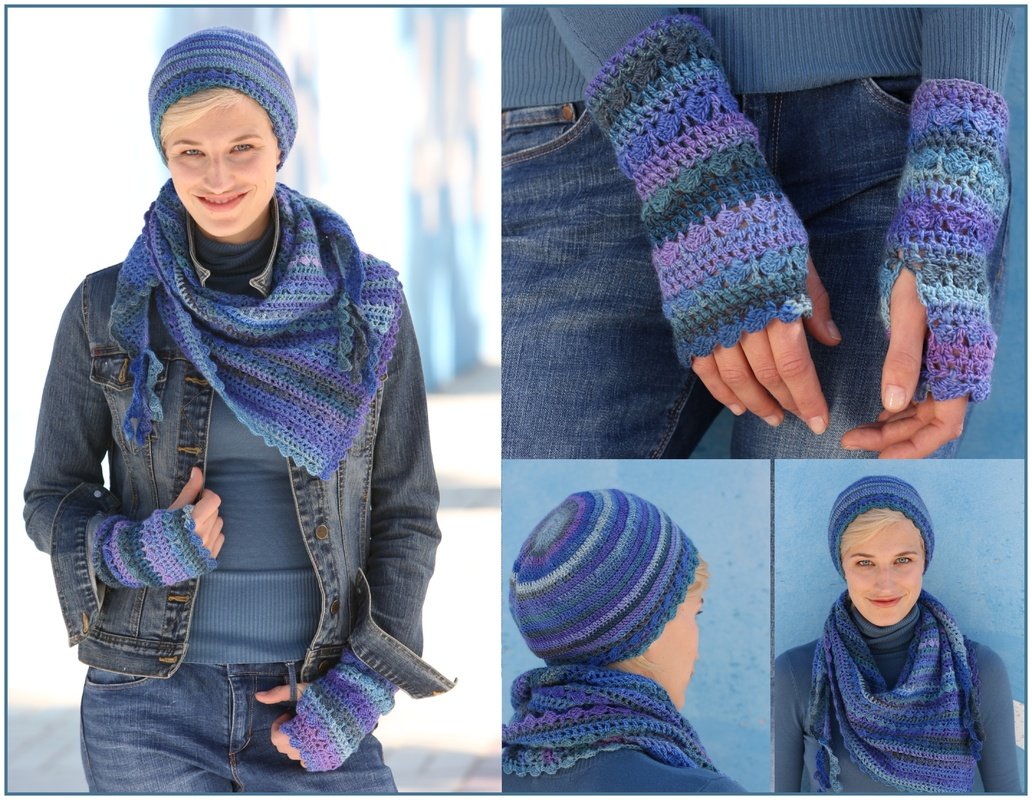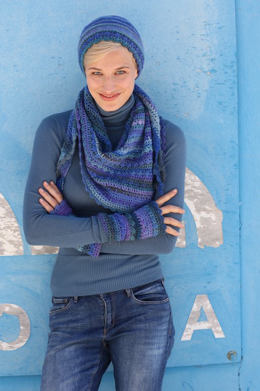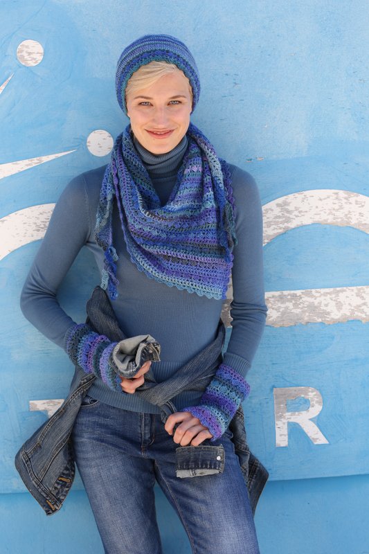 Material für die Armstulpen und die Mütze jeweils: 50 g Lila Color (Farbe 845.0088); für das Tuch: 150 g Lila Color „Mille Colori Baby“ (100% Schurwolle, LL = 190 M/50 g) von LANG YARNS. 1 PRYM-Häkel-N Nr. 3,5.