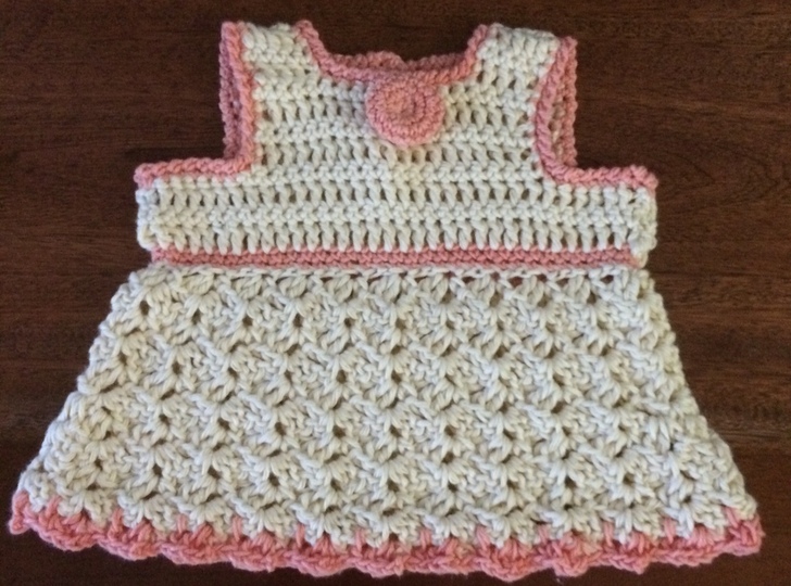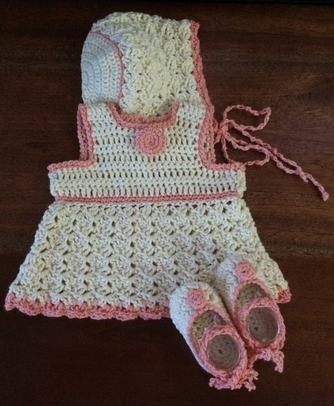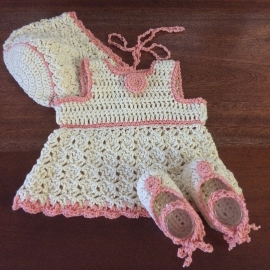 This easy breezy baby girl sweet cotton summer crochet set in made in a beautiful shell pattern. The dress, bonnet and ballet flats are for a newborn baby girl.