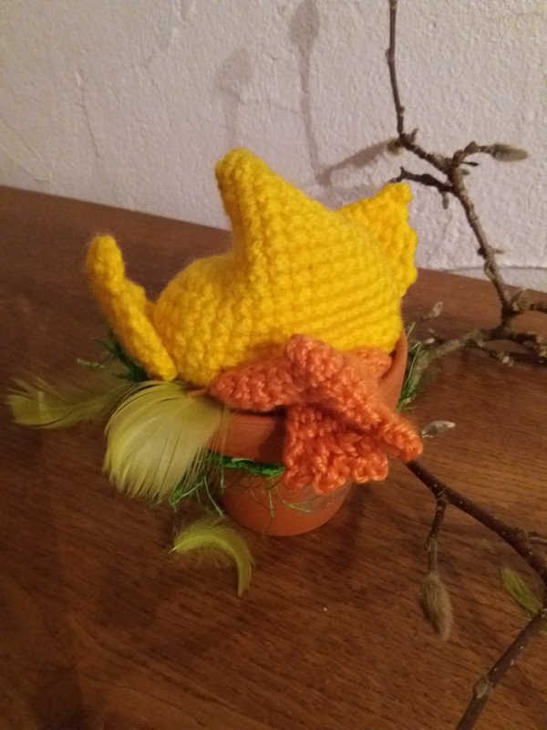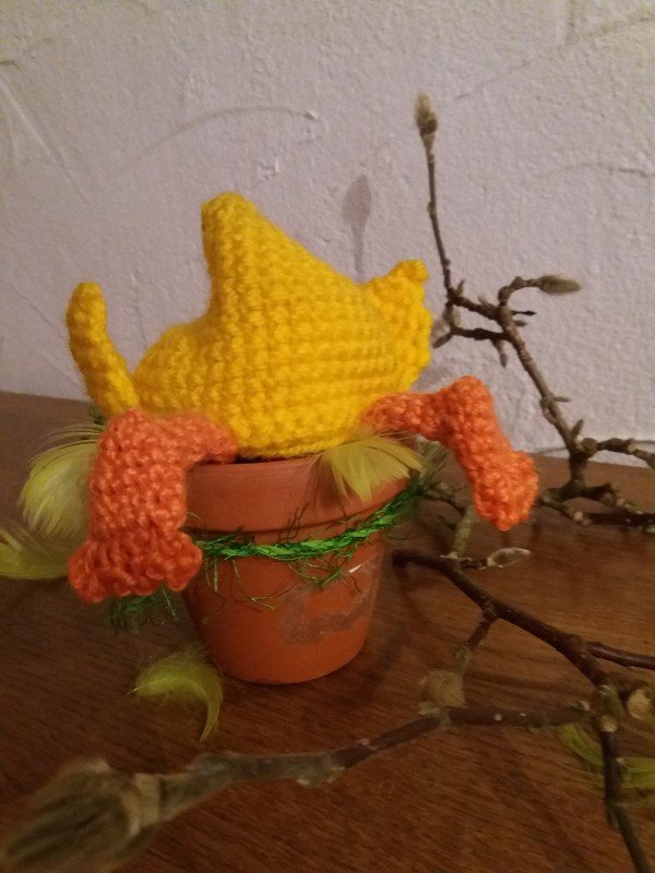 Verwendet wurden hier Wolle von Schachenmayr Nomotta Bravo in gelb 50g= ca. 80m, Strickgarn in orange 50g = ca. 130m, eine Häkelnadel Größe 3, Nähnadel und ein Tontopf mit 9cm Durchmesser.