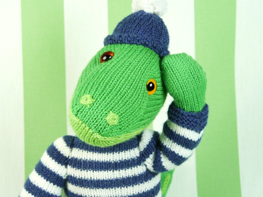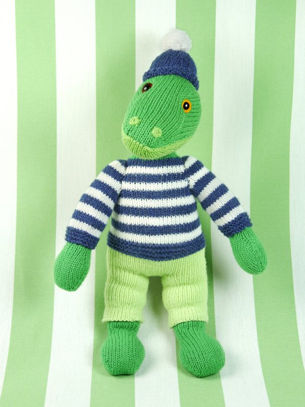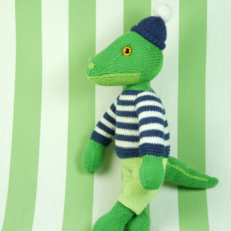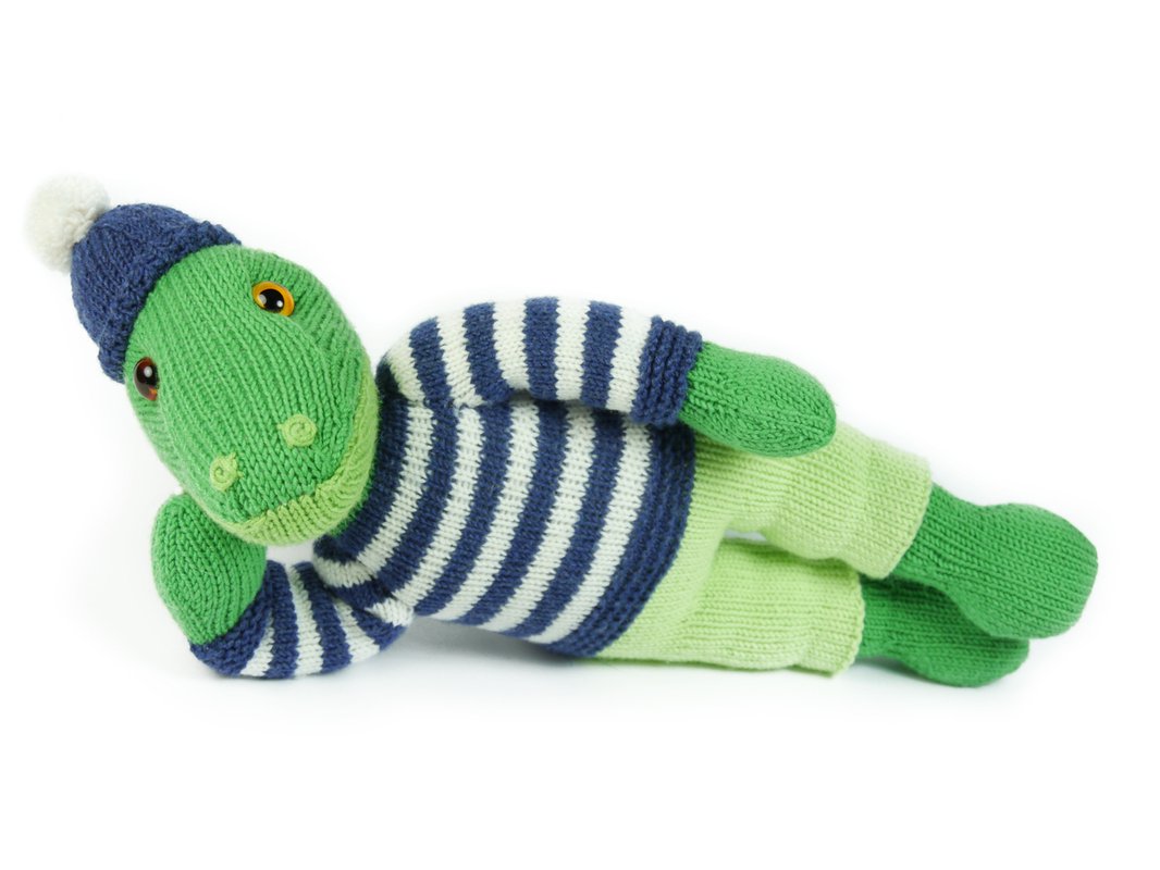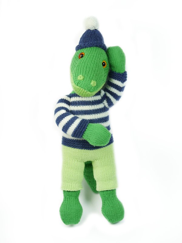 Cord is probably the most gentle crocodile you will ever meet. In contrary to his relatives from the Nile, he is a vegetarian, and he absolutely loves to to cuddle with his human friends. Nevertheless, like all crocs he is rather obsessed with rivers and would love to become a skipper when he grows older. I couldn‘t buy him a boat so far, so the least I could do to make him happy was to fit him out with a striped sailors sweater and a cool cap.