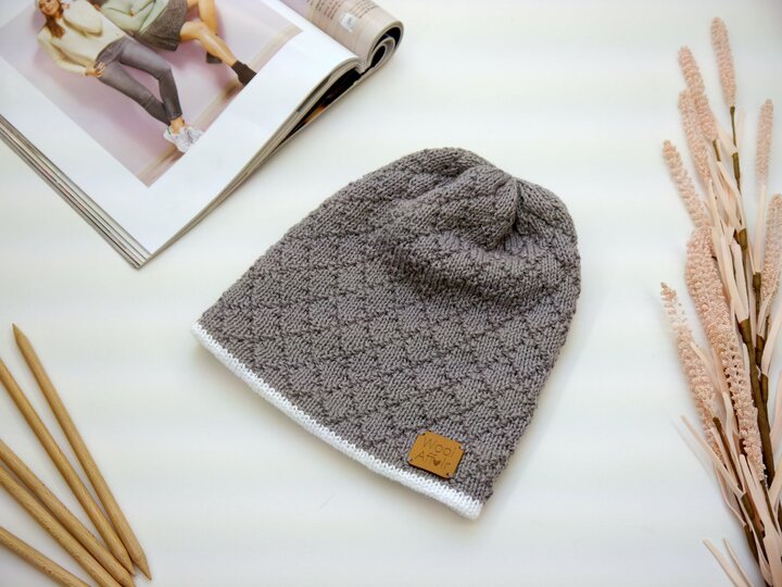 This beanie is an eye-catcher for sure. Our pattern gives detailed instructions for 6 sizes from XS (head size 20.3 in) to XXL (24.8 in). You will have much fun knitting this pattern and it goes very quick, too. You can knit it with 2 different colors and even 2 different stitches. One side is knitted with the stockinette stitch, but with a yarn with a gradient color run. The other side in knitted with the diamond pattern. You can choose each day, which style you prefer. As a result, you get 2 new beanies in 1!