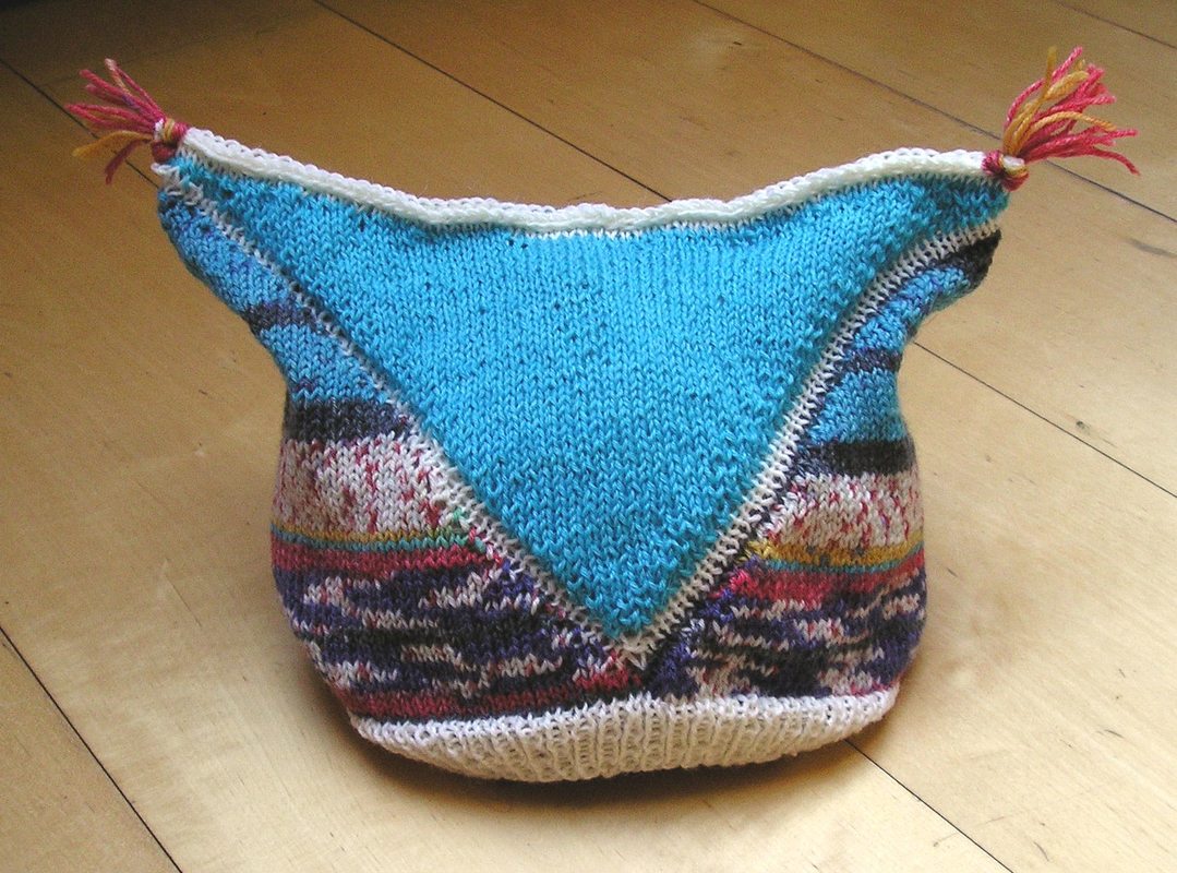 Die Mütze wird mit einem Nadelspiel rund gestrickt. Nach dem Bündchen beginnt man wie bei der Bumerangferse bei Socken mit verkürzten Reihen zwei Berge aufzutürmen. Diese werden mit weiß umrahmt. Anschließend fültt man ebenfalls mit verkürzten Reihen die Täler wieder auf. Noch 2 Runden Weiß und fertig ist di Mütze. Ach, und zusammennähen muss man die obere Kante auch noch. Man kann auch sehr gut Wollreste dafür benutzen. Es entsteht eine auf jeden Fall sehr witzige Mütze.