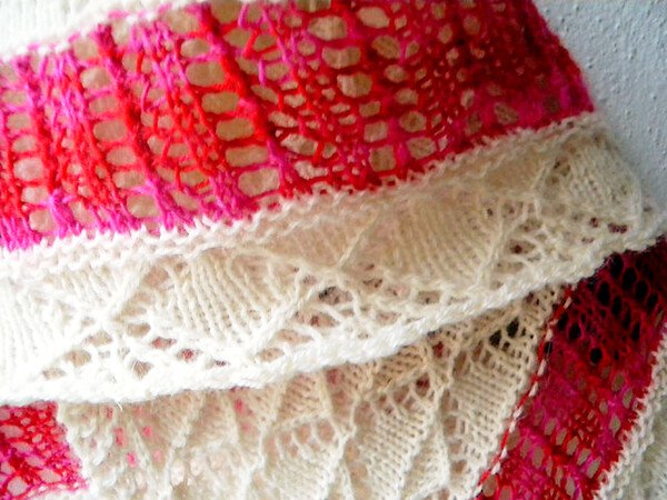 The sample shown in the pictures was made out of Knit Picks Bare Hare in wihite, which is a very soft merino wool and angora blend in fingering weight that feels heavenly when you knit it. The contrast stripe in red was a leftover of Lana Grossa Meilenweit Special, a soft sock yarn that is available in my part of the world, nothing very special, but a terrific match with the white - in my opinion. The pattern has been tested by several ladies who used a variety of yarns, among them gradients and self striping yarns, blacks and greens and whatever they thought would look good. The overall impression changes with the yarn, but all of them had a beautiful shawl at the end of the day.