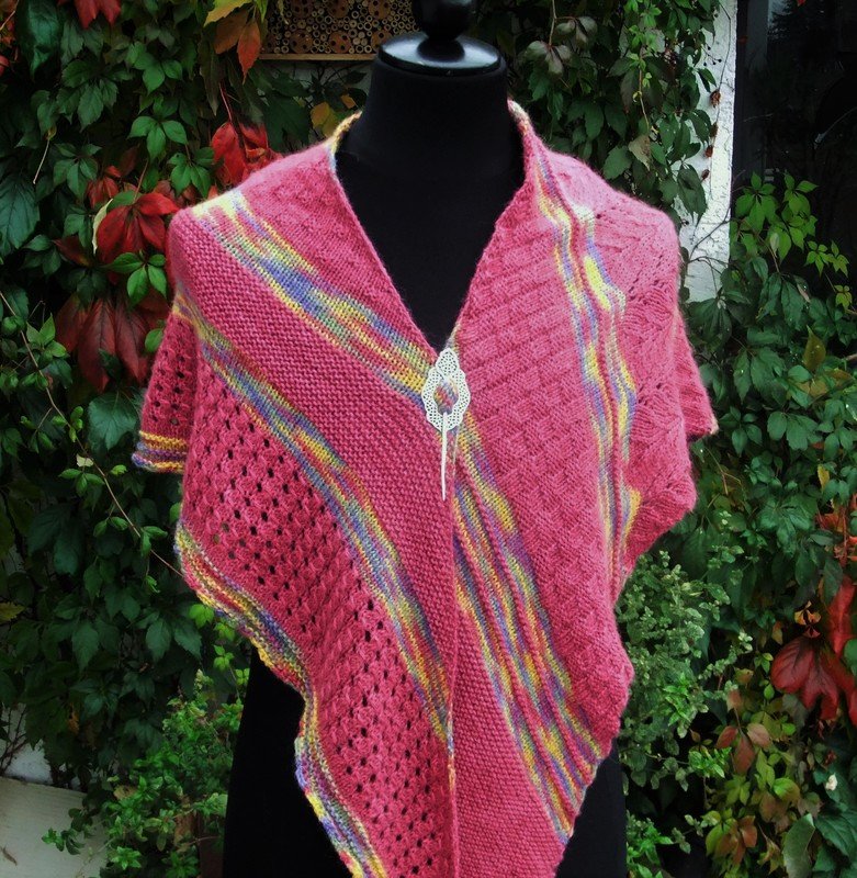 Yarn: (3) 100 g [3.5 oz] skeins Alpaca Fino, of these: 2 skeins solid-colored, 1 skein multi-colored, yardage 200 m [219 yds] per skein. Yarn for shawl in photo hand dyed by Sonja’s Wollanstalt