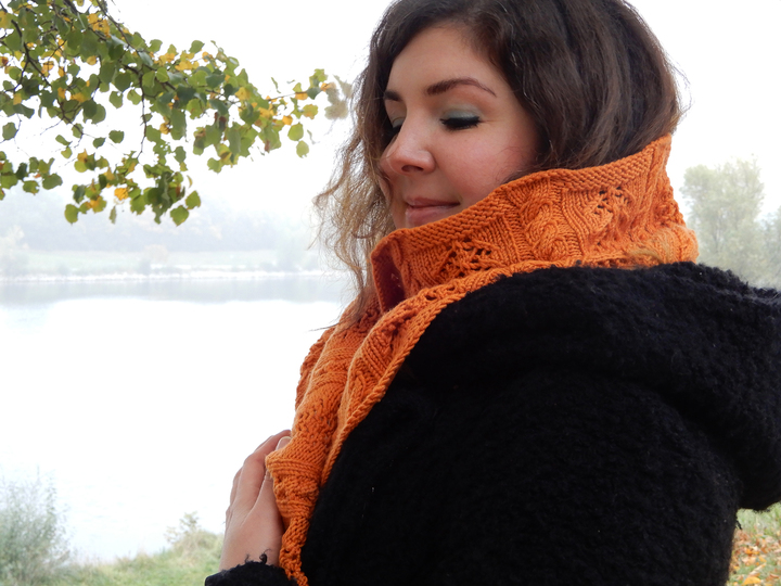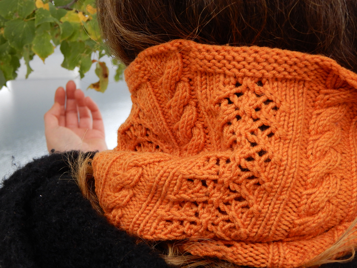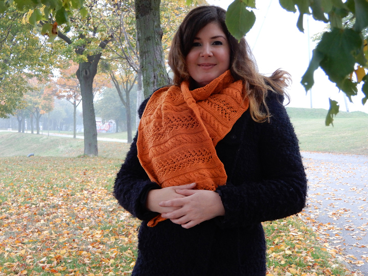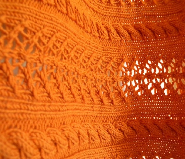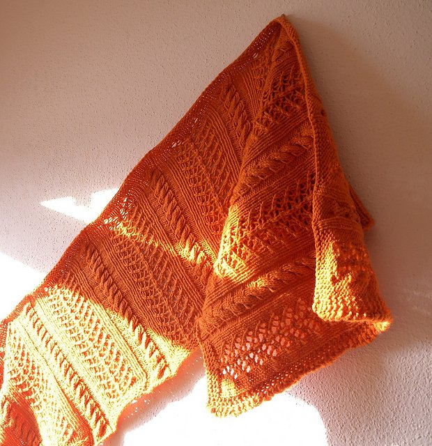 This rectangle stole is worked lengthwise in a lace and cables pattern. Lots of stitches on your needles. It is not at all difficult to knit, the pattern is repetitive and very relaxing to work on. It is both written and charted.