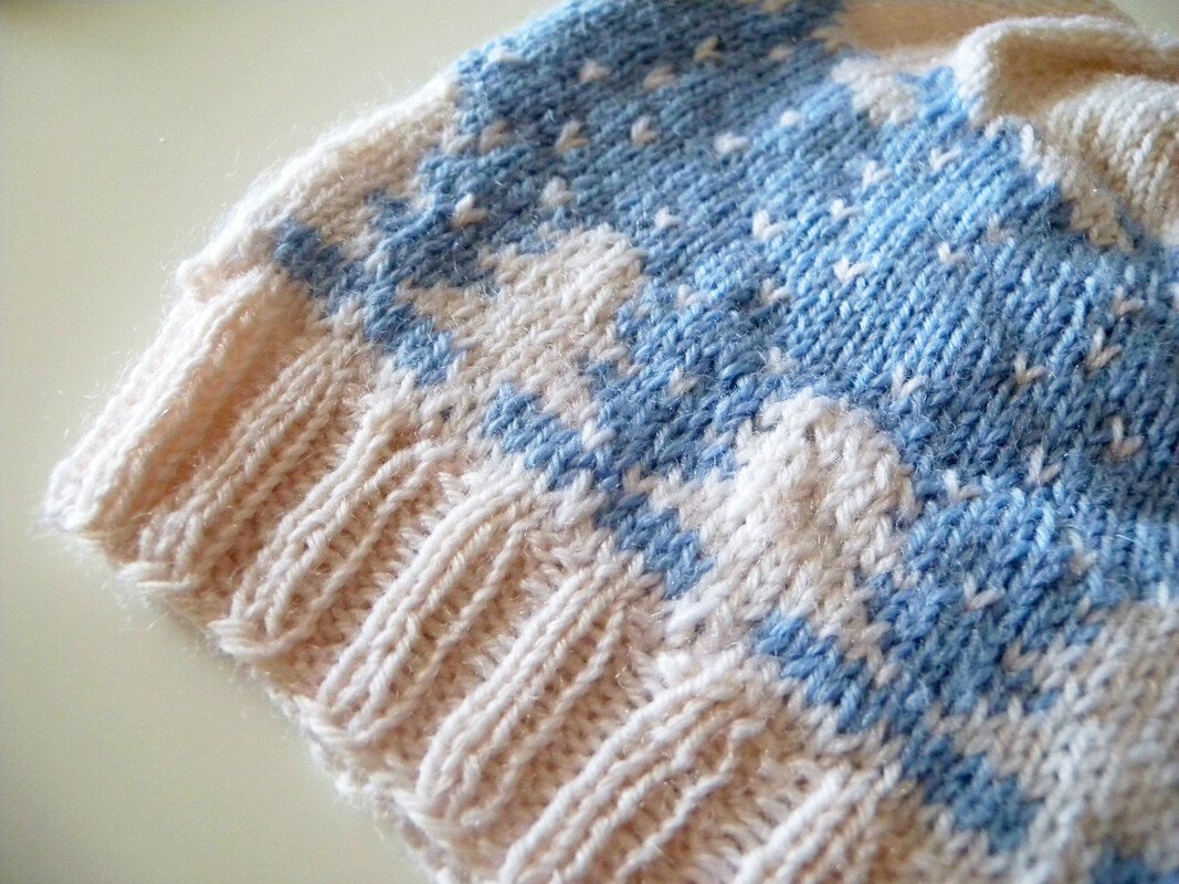 Yarn: Steinbach Strapaz (80% wool, 20% nylon; 150m/50g; 164yds/1.76oz), 1 ball of each color. Sample in size medium used 75m (82yds) of main color in white and 39m (43yds) of contrast color in blue.