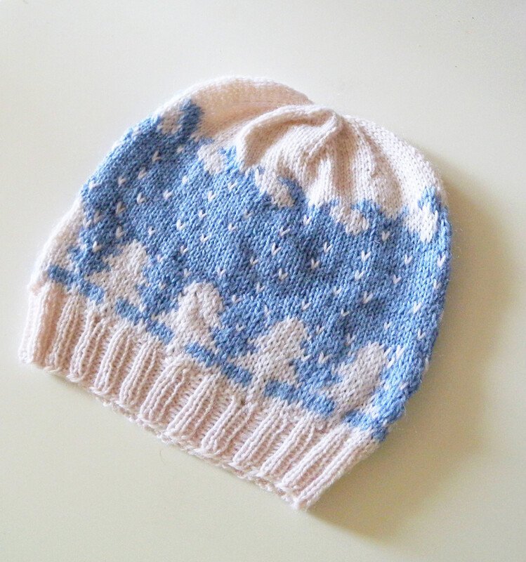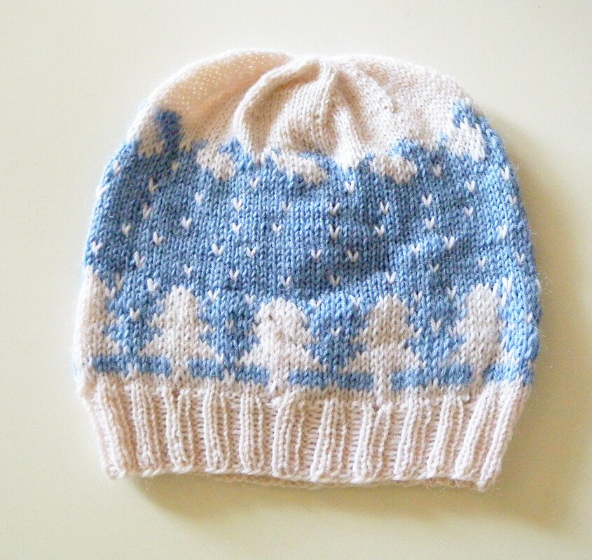 This beanie is worked from the bottom to the top. After completing the ribbing, you will switch to stranded colorwork to create your snow covered trees, snowflakes and fluffy white clouds. The stranded pattern is charted only, you need to know how to read charts if you want to knit the hat.