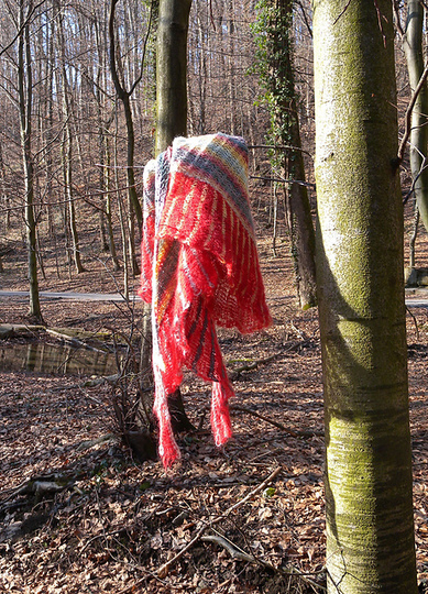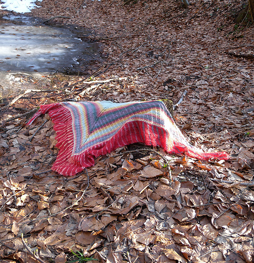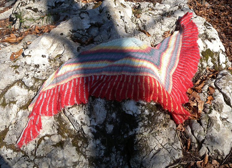It is worked top down, starting with a garter tab and increasing in every second row. The more sturdy body of the shawl is knitted in fingering, using a simplified brioche stitch (the one that my mother taught me a long time ago), the airy border is knit-on sideways and done in lace weight. The body does not require any purls, it is almost garter stitch. For the border you will have to work short rows.