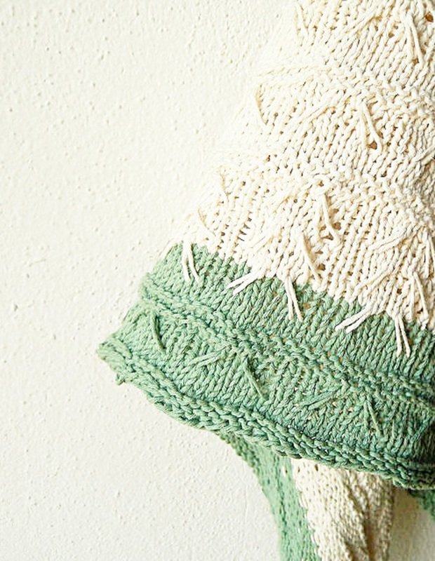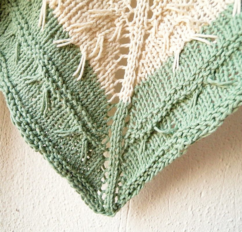 Relief is a triangle shaped shawl worked in a DK weight cotton yarn. The pattern uses slip stitch cables and texture to create interest. The cables can be worked with or without a cable needle, both options are explained in the pattern. Use one color or two colors, use any other yarn that you like, but be aware that the amount of yarn needed may vary.