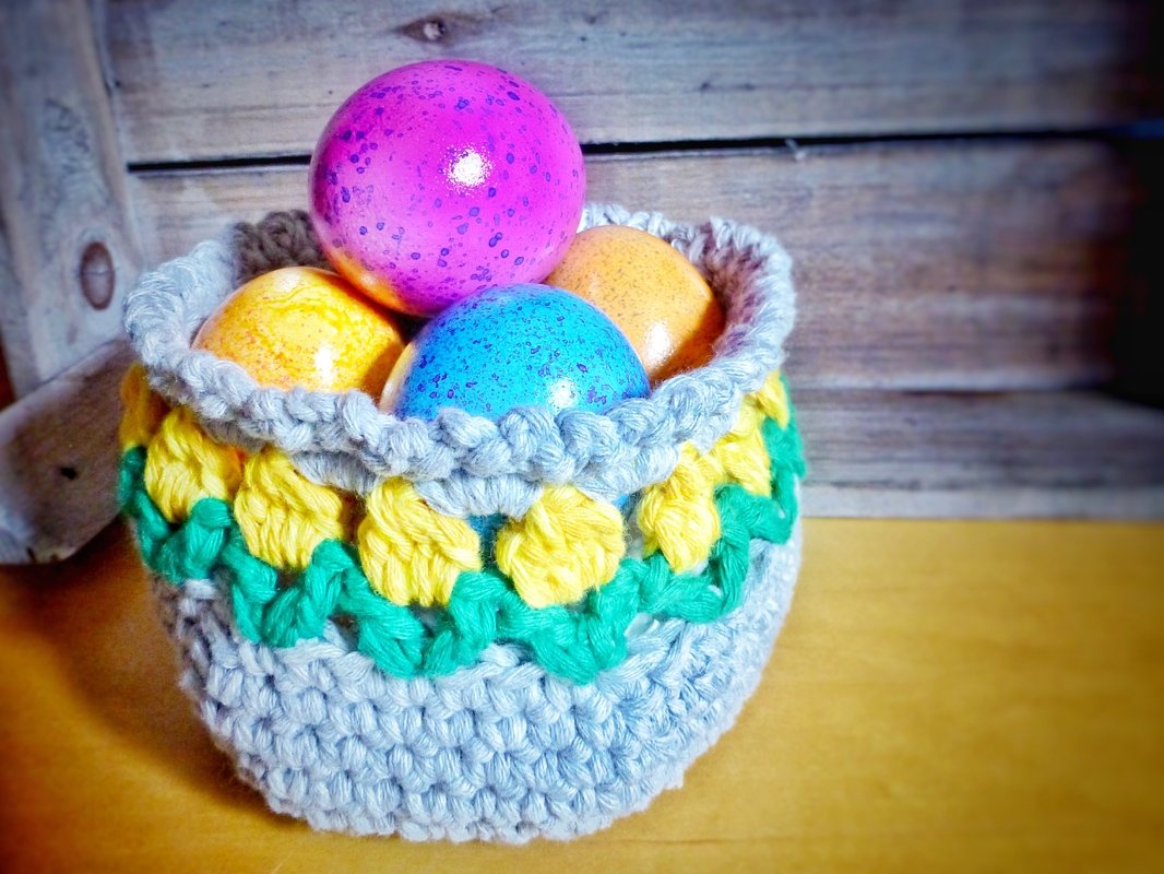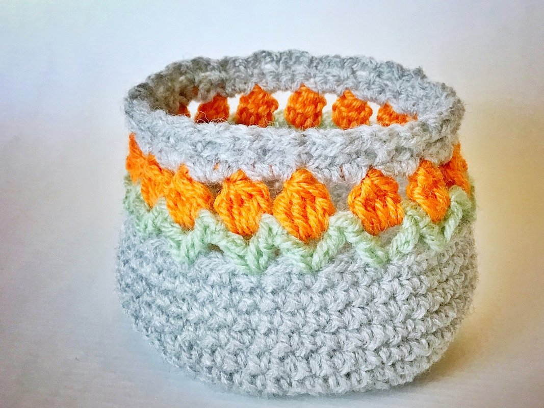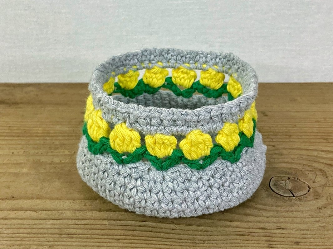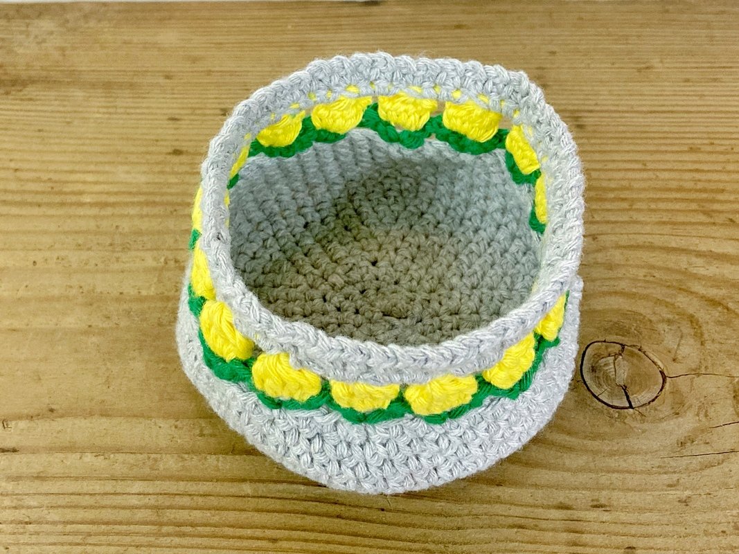 Gehäkelt mit Nadelstärke 4 wird das Körbchen ca. 11cm im Durchmesser und 8 cm hoch