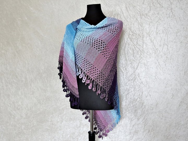 The shawl can be worked in many yarn weights. The size is variable, too.