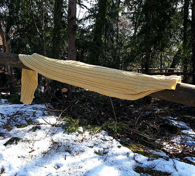 Knitted during the coldest days of winter, surrounded by high heaps of snow, the color of the yarn made me think of walking over warm sand in summer. A very pleasant image. That’s the simple explanation for the name of this scarf.