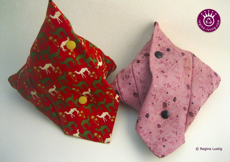 Die Größe der Täschchen ist von der Größe und Form der Krawatten und wie sie vor dem Nähen gelegt werden, abhängig. Die Größen bewegen sich ca. zwischen 14 x 16 cm und 10 x 20 cm.