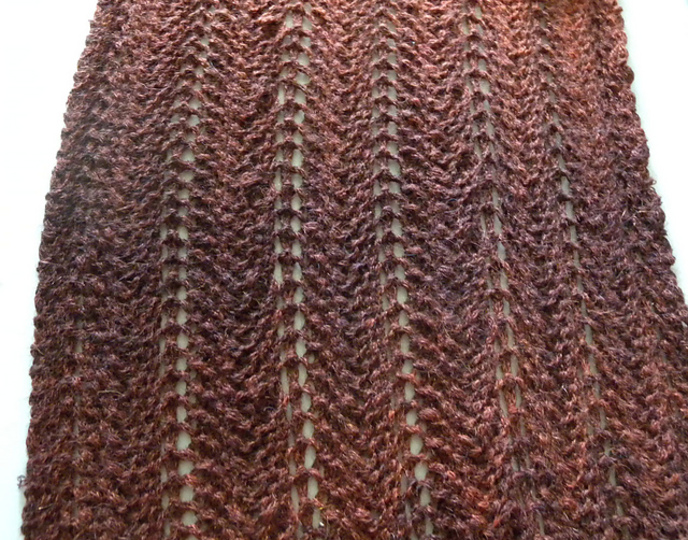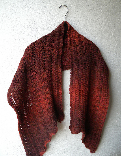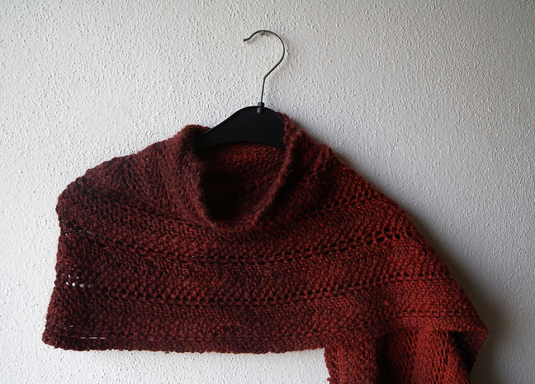 The Garter Hug is an easy and relaxing stole to knit. It is worked from side to side in a chevron pattern. There are no purls involved. The rounded shape is achieved by using short rows.