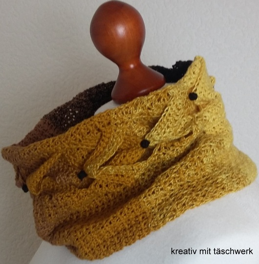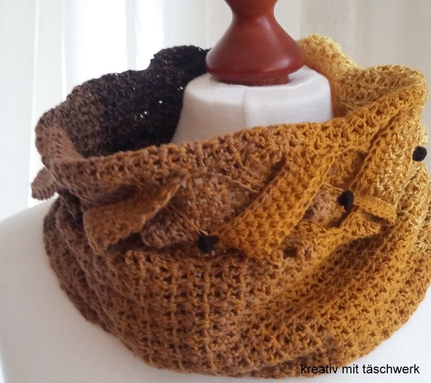 Dieser auffällig schöne, gehäkelte Baumwoll - Sommer - Loop ist schon etwas besonderes. Die Steifen mit den Büschelmaschen sind ein Blickfang und ergänzen das einfache Muster.