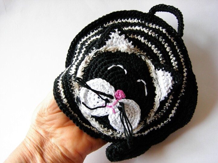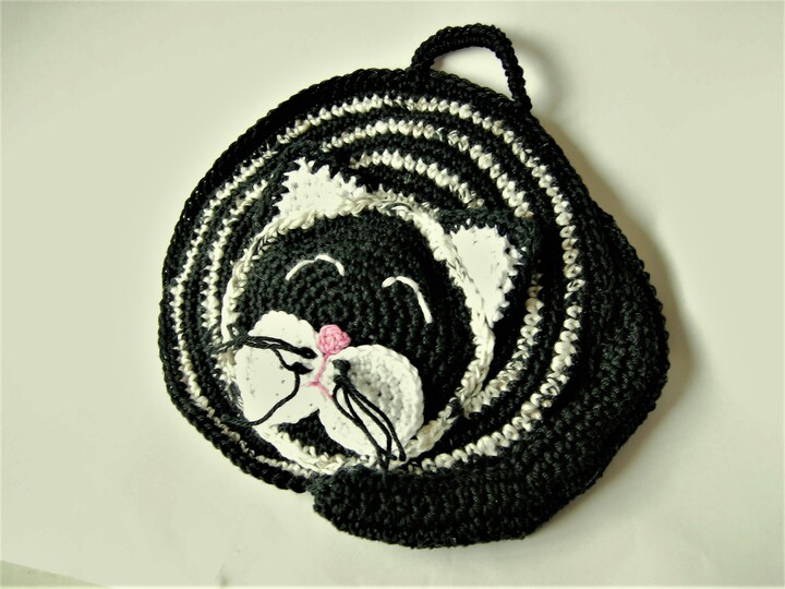 Die kleine Katze schläft gemütlich in der Küche, aber wenn sie als Topflappen gebraucht wird, ist sie sofort zur Stelle!
