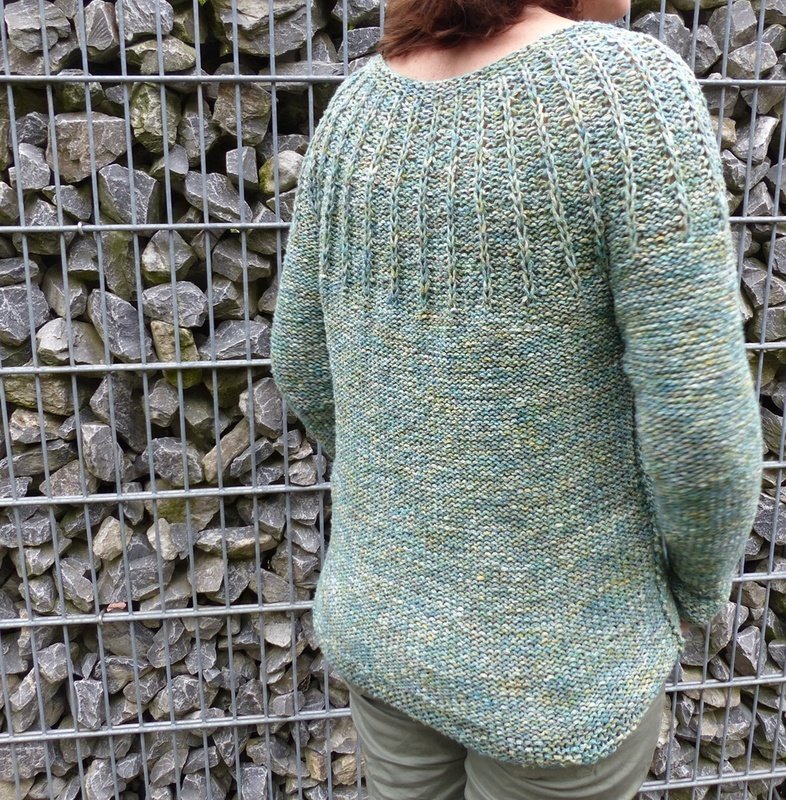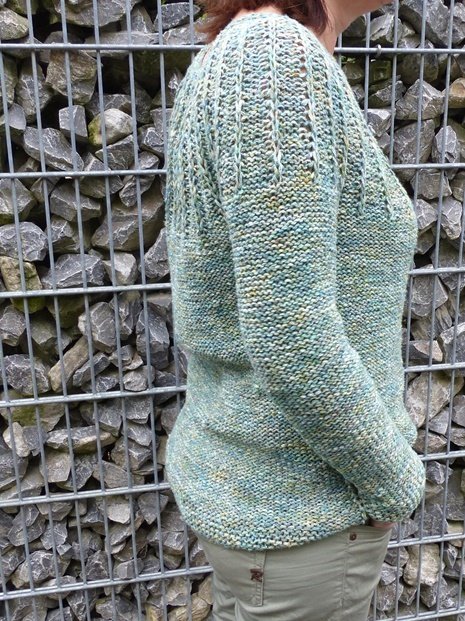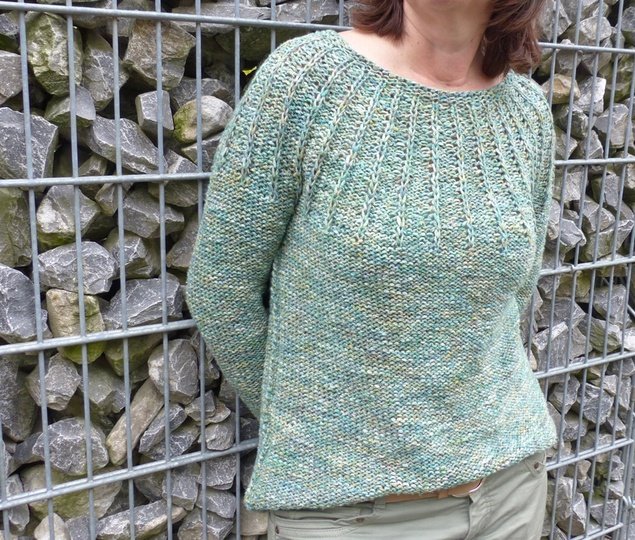 Der Pullover ist in kraus links gestrickt worden und hat eine Rundpasse mit Hebemaschen.