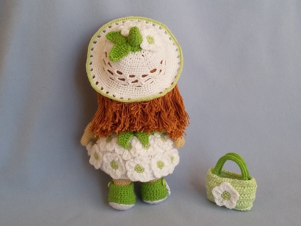 The PDF contains the instructions for the doll, the summer hat, the shoes, the dress, the panties, the pocket and the flowers and leaves.