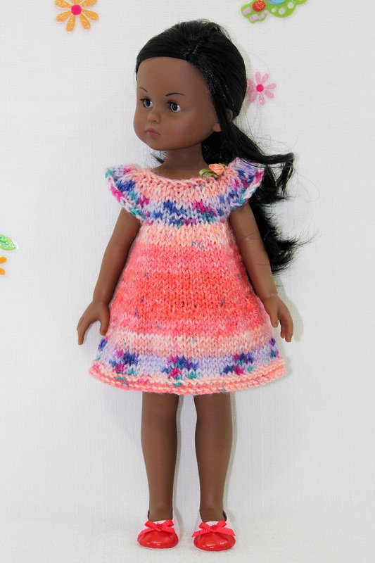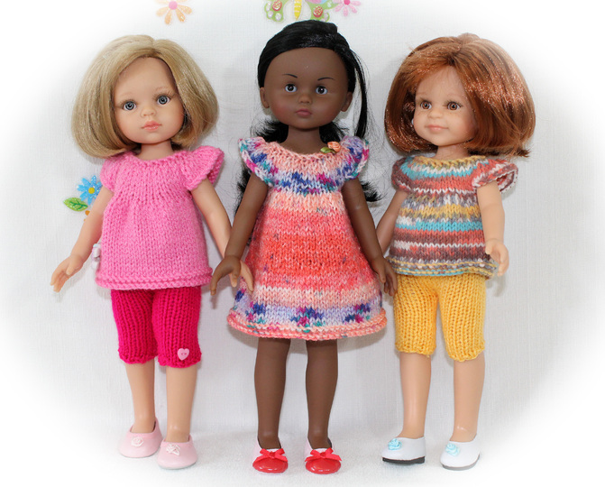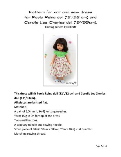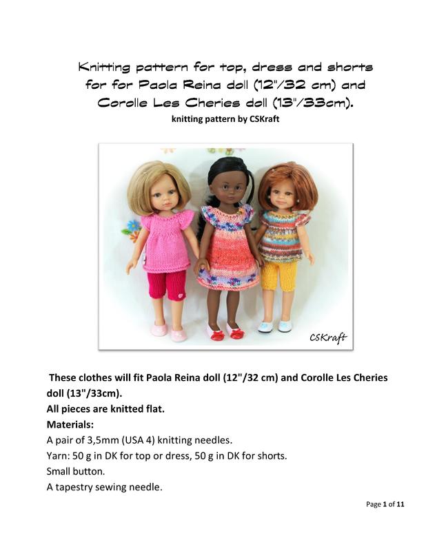 This pattern includes 11 pages of row by row instruction and pictures how to make knitted dress, top and shorts and knit and sew dress for Paola Reina doll (12"/32 cm) and Corolle Les Cheries doll (13"/33cm).